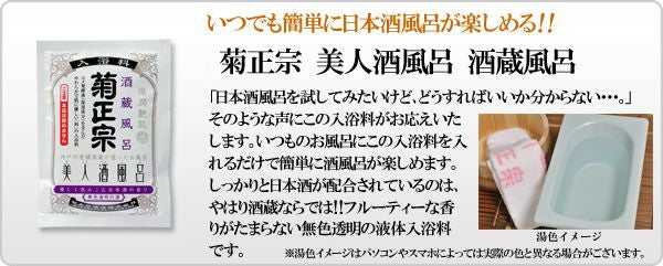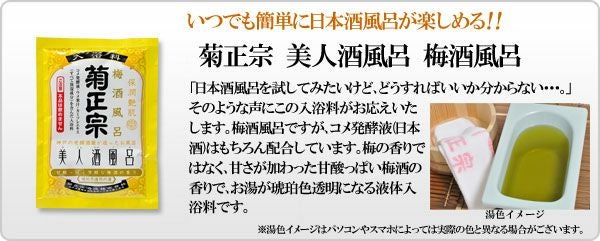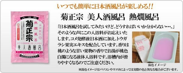 他の画像を見る 【SNSで人気に♪】手軽に酒風呂が楽しめる便利な1回使い切りタイプ。 「菊正宗 美人酒風呂 熱燗風呂 60mL」【甘い果実の香り】 当店価格 ¥ 275 税込 カートに入れる お気に入りに登録する