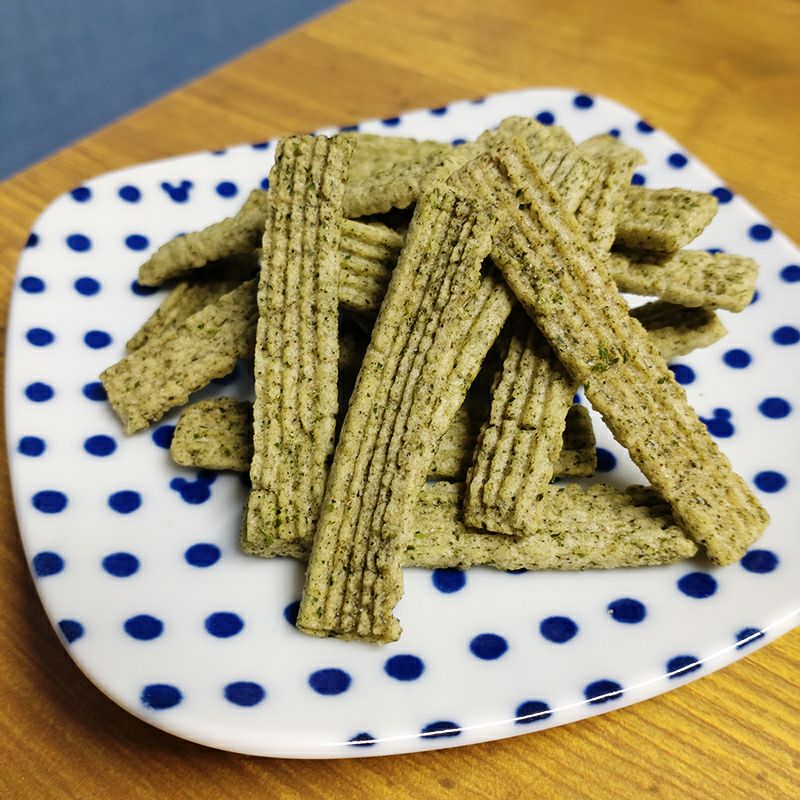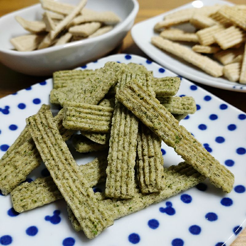 練込んだわかめとひじきの潮の香りがおいしさを引き立てています。ギザギザ形状で、カリッとした食感は、くせになるおいしさです。