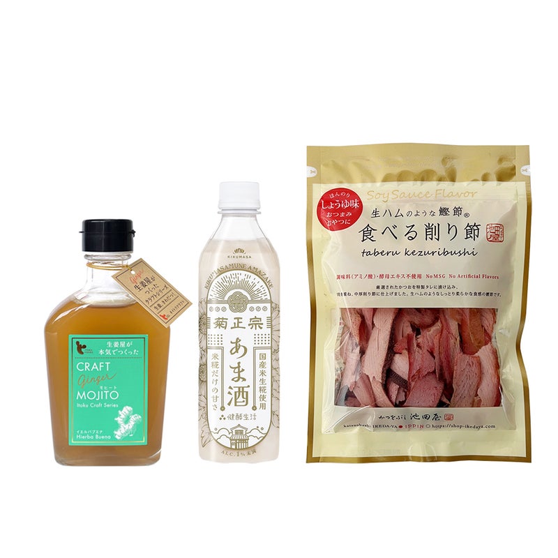 お酒は呑めない、、、けれど、飲み会やパーティーで皆でワイワイ楽しむ雰囲気は好き!おうちで皆で集まる日、ちょっと今日はいつもと違う飲み物を楽しみたい!甘めの飲み物は好き☆そんな方のためのちょっとお得なノンアルセットです。 あま酒を氷で割ったり、温めたり、夏はジンジャーモヒートシロップをアレンジしてカクテル気分♪ 人気の「生ハムのような鰹節 食べる削り節 かつお」をおつまみに。この夏も楽しみましょう♪
