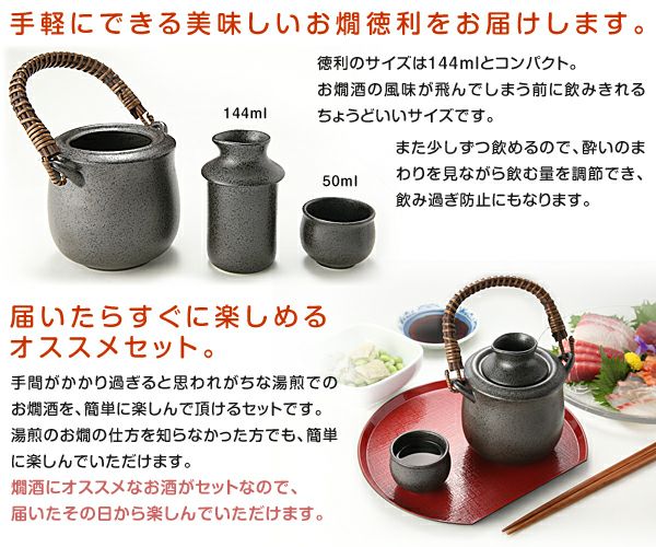 届いたその日にすぐ楽しめる、つる付お燗徳利と日本酒のセット。お燗徳利は見た目も渋く、食卓にしっくりと馴染みます。毎日の晩酌にもピッタリのセットです。