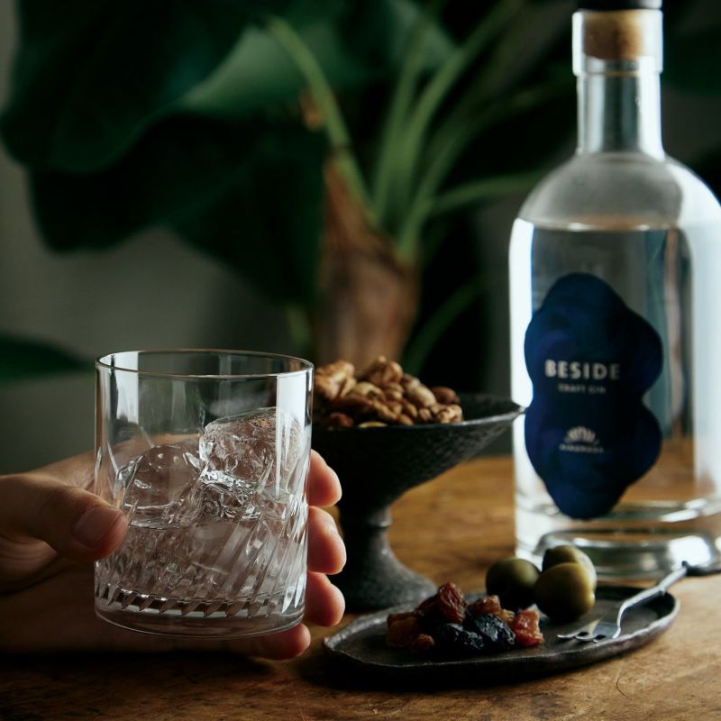 まずはロックでおためしを 幾重にも広がる甘みと繊細で穏やかな香りを感じて 甘くやわらかな口当たりのBESIDEは一口目のきつさがなく、40%というアルコール度数を感じさせません。ロックグラスの氷が溶けるにつれ、その味わいは少しずつ表情を変えます。一口ごとに変化する香りと味を探すようにお召し上がりください。 香りが主張しすぎないので、ジントニックやマティーニ、ホットジンなどプロユースの本格カクテルベースとしても最適です。