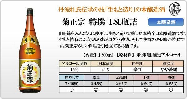灘の名水「宮水」を仕込み水として、麹米に「山田錦」を使用。ゴク味のある辛口本醸造酒です。菊正宗らしい、食事に合う食中酒としておすすめです。